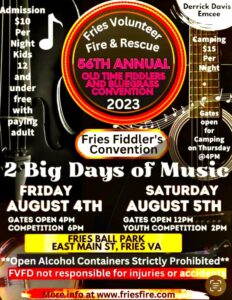 The 56th Annual Old Time Fiddlers and Bluegrass Convention will be held August 4th and 5th, 2023 at the Fries Ballpark. Friday gates open at 4 p.m. and Saturday gates open at 12 p.m.