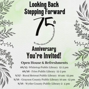 The 75th Anniversary of the Wythe-Grayson Regional Library will be celebrated with an open house at the Fries Public Library, August 16, 12-2 p.m.