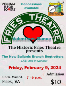The New Ballards Branch Bogtrotters will be playing at The Historic Fries Theatre. Doors open at 6. Music starts at 7. Concessions available. 50/50. Door prizes! The Historic Fries Theatre is proud to be an Affiliated Venue of The Crooked Road: Virginia’s Heritage Music Trail.