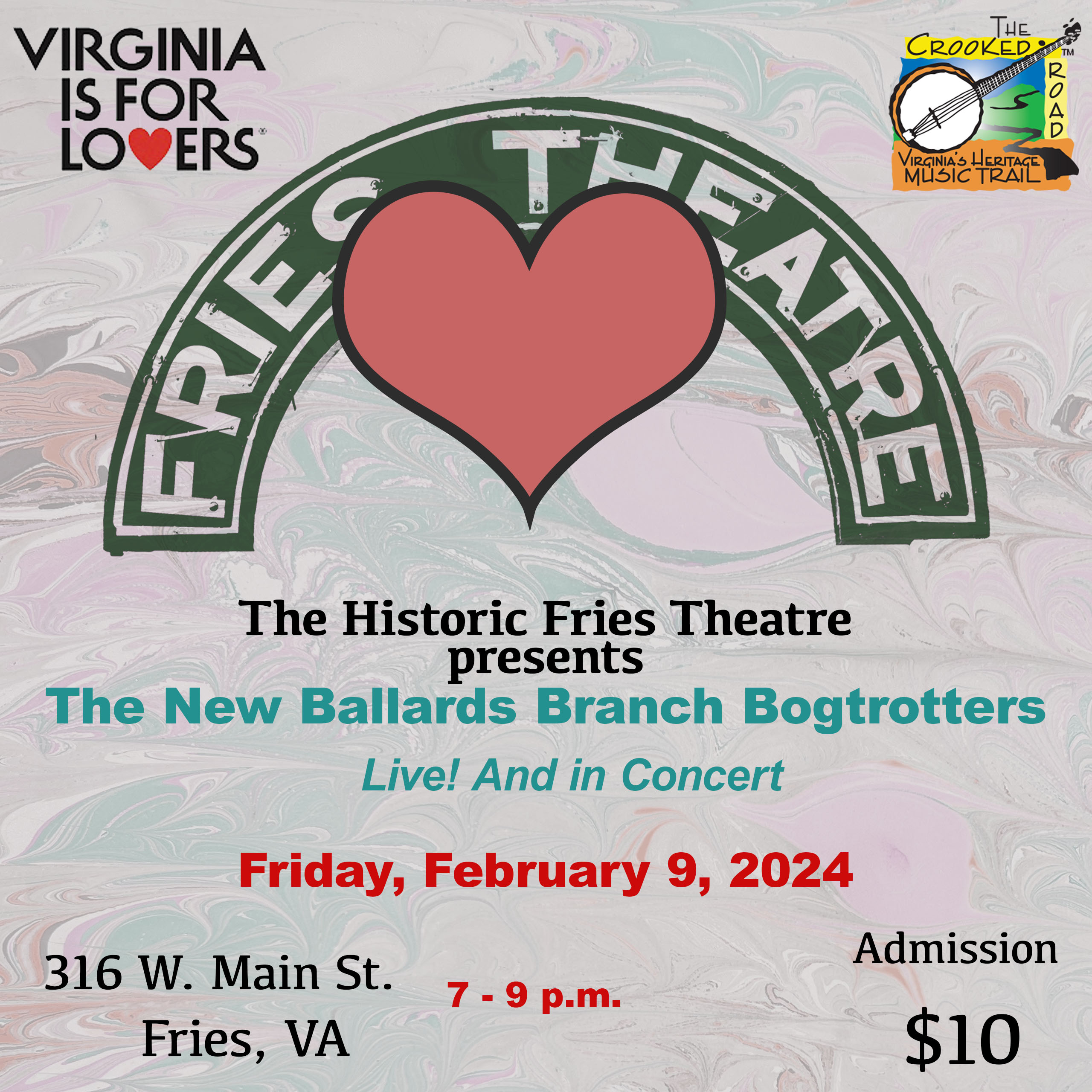 The Historic Fries Theatre 316 W. Main Street, Fries, VirginiaThe New Ballards Branch Bogtrotters will be playing at The Historic Fries Theatre. Doors open at 6. Music starts at 7. Concessions available. 50/50. Door prizes! The Historic Fries Theatre is proud to be an Affiliated Venue of The Crooked Road: Virginia's Heritage Music Trail.