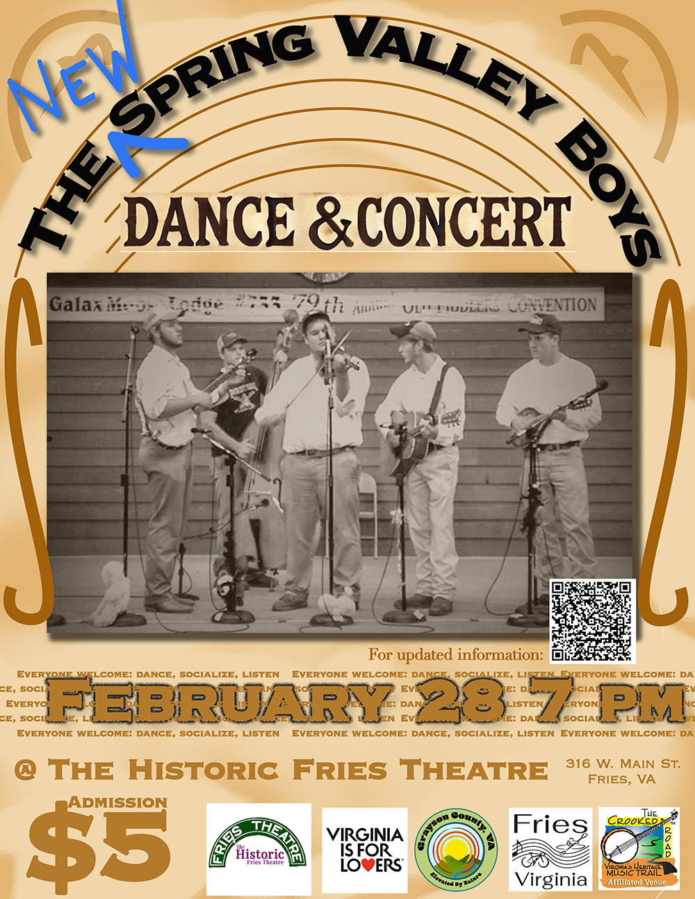 The Historic Fries Theatre 316 W. Main Street, Fries, VirginiaThe New Spring Valley Boys at The Historic Fries Theatre. Feb 28 - Dance and concert. 7 pm.