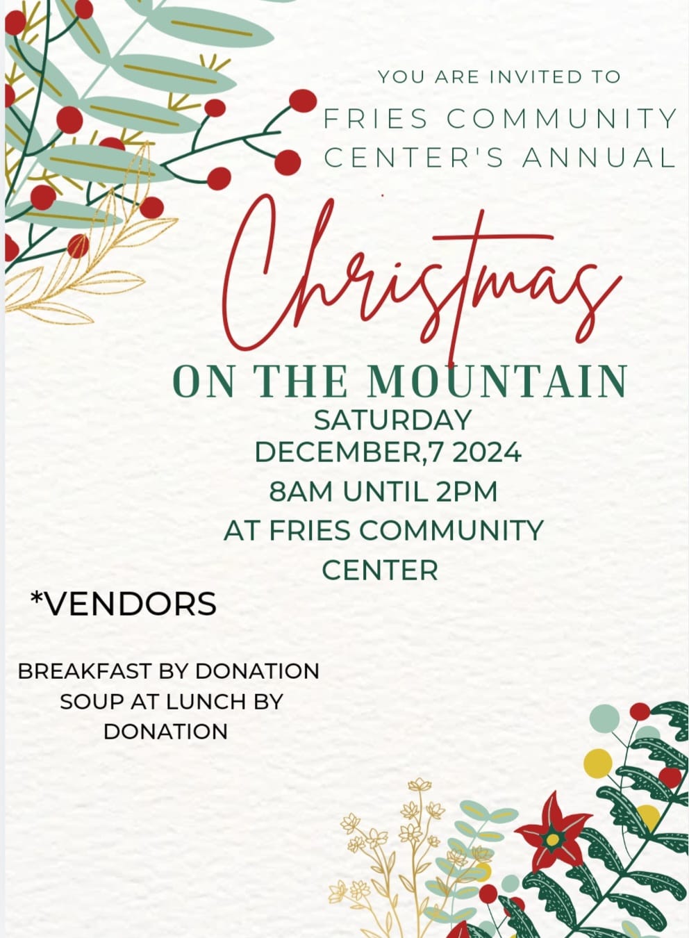 Fries Community Center 316 W. Main Street, Fries, VirginiaMarket opens every Saturday - food, art, crafts and more! Moved inside to the Community Center. Free coffee provided by the Town of Fries.